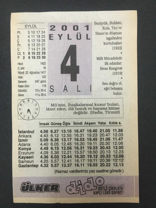 4 EYLÜL 2001-TAKVİM YAPRAĞI-DOĞUM GÜNÜ HEDİYESİ-ÜLKER TAKVİMİ,BOZÜYÜK,BULDAN,KULA,TİRE,VE SİMAVIN DÜŞMAN İŞGALİNDEN KURTULUŞLARI 1922,SİVAS KONGRESİ 1919,AĞIZ SAĞLIĞI DİŞLER başlıklı ürün, Efemera, Müzik, Sinema > Belge ve Evraklar > Takvimler kategorisi altında İkinci El olarak satılmaktadır.
