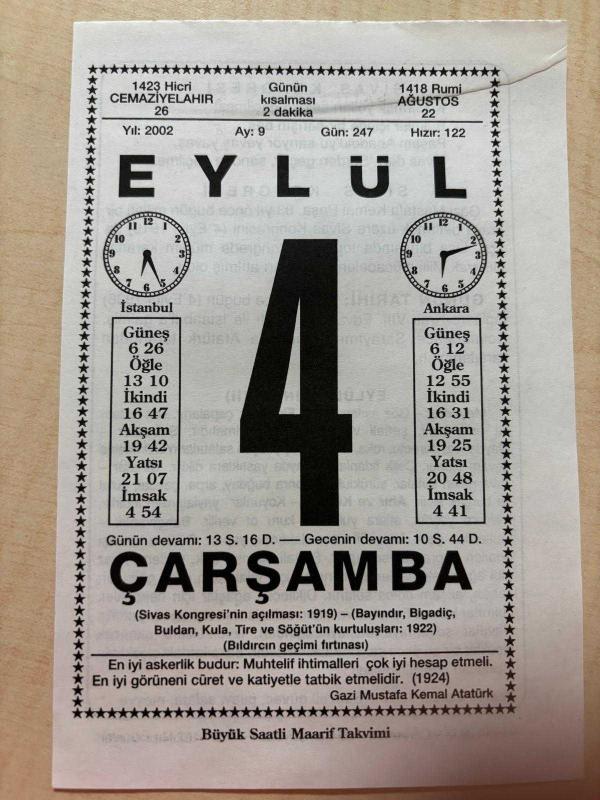 4 EYLÜL 2002 - TAKVİM YAPRAĞI - DOĞUM GÜNÜ HEDİYESİ - BÜYÜK SAATLİ MAARİF TAKVİMİ - GAZİ MUSTAFA KEMAL ATATÜRK - SİVAS KONGRESİ - İNGİLTERE KRAL VIII.EDVARD DOLMABAHÇE'YE GELDİ - EYLÜL AYINDA; MEYVELER - SEBZELER - TARLALAR - AHIR VE KÜMES - BAHÇIVANLIK, 5 ay önce satışa sunulmuştur.