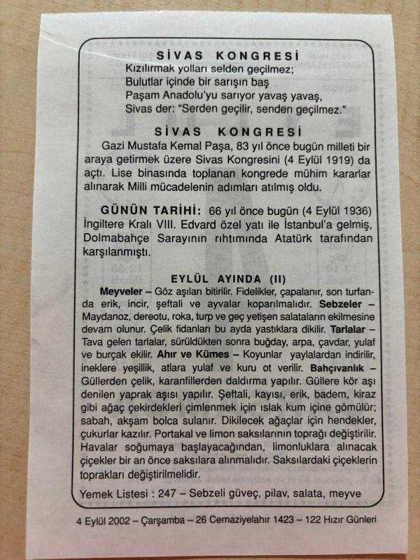 4 EYLÜL 2002 - TAKVİM YAPRAĞI - DOĞUM GÜNÜ HEDİYESİ - BÜYÜK SAATLİ MAARİF TAKVİMİ - GAZİ MUSTAFA KEMAL ATATÜRK - SİVAS KONGRESİ - İNGİLTERE KRAL VIII.EDVARD DOLMABAHÇE'YE GELDİ - EYLÜL AYINDA; MEYVELER - SEBZELER - TARLALAR - AHIR VE KÜMES - BAHÇIVANLIK başlıklı ürün, Efemera, Müzik, Sinema > Belge ve Evraklar > Takvimler kategorisi altında İkinci El olarak satılmaktadır.
