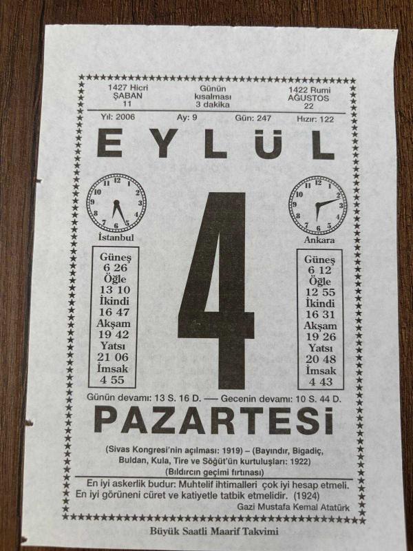 4 EYLÜL 2006 - TAKVİM YAPRAĞI - DOĞUM GÜNÜ HEDİYESİ - BÜYÜK SAATLİ MAARİF TAKVİMİ - GAZİ MUSTAFA KEMAL ATATÜRK - SİVAS KONGRESİ - İNGİLTERE KRAL VIII.EDVARD DOLMABAHÇE'YE GELDİ - EYLÜL AYINDA BİLİNMESİ GEREKENLER, en son 8 ay önce güncellenmiştir.