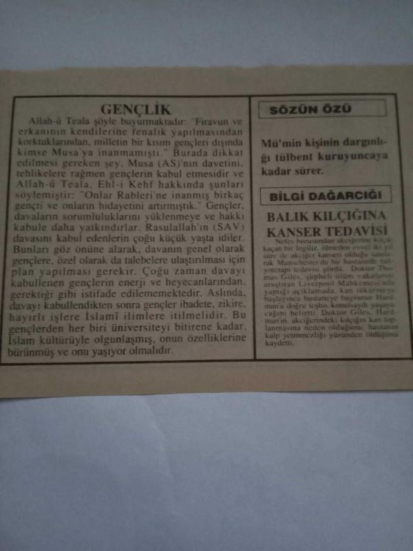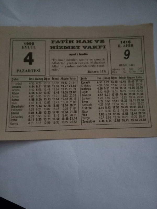 4 Eylül 1995-Orijinal Takvim Yaprağı-Doğum Günü-Söz,Nişan,Nikâh,Düğün ve Önemli Günler Hediyesi-Fatih Hak ve Hizmet Vakfı-Ayet/Hadis(Bakara:153)-Gençlik-Sözün Özü-Balık Kılçığına Kanser Tedavisi, 25 gün önce satışa sunulmuştur.