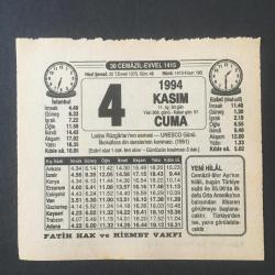 4 KASIM 1994 -TAKVİM YAPRAĞI-DOĞUM GÜNÜ HEDİYESİ-FATİH HAK VE HİZMET VAKFI TAKVİMİ,LODOS RÜZGARLARININ ESMESİ,UNESCO GÜNÜ,İLKOKULLARA DİN DERSLERİNİN KONMASI 1951,DUANIN MAKBUL VAKİTLERİ,PRATİK BİLGİLER, en son 8 ay önce güncellenmiştir.