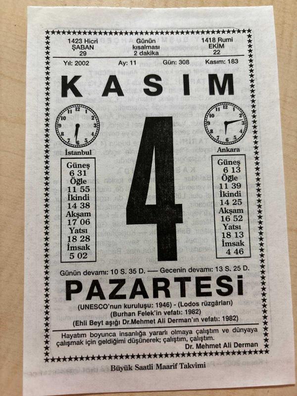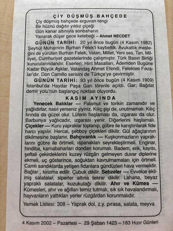 4 KASIM 2002 - TAKVİM YAPRAĞI - DOĞUM GÜNÜ HEDİYESİ - BÜYÜK SAATLİ MAARİF TAKVİMİ - DR. MEHMET ALİ DERMAN - AHMET NECDET - ŞEYHÜL MUHARRİRİN BURHAN FELEK VEFAT ETTİ - YENECEK BALIKLAR, ÇİÇEKLER, BAHÇIVANLIK, SEBZELER, AHIR VE KÜMES, en son 8 ay önce güncellenmiştir.