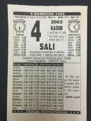 4 KASIM 2003-TAKVİM YAPRAĞI-DOĞUM GÜNÜ HEDİYESİ-TÜRKİYE GAZETESİ TAKVİMİ,OSMANLI ORDUSUNUN SOFYAYA GİRİŞİ,1398,LODOS RÜZGARLARI UNESCO GÜNÜ,RAMAZAN AYI, en son 8 ay önce güncellenmiştir.