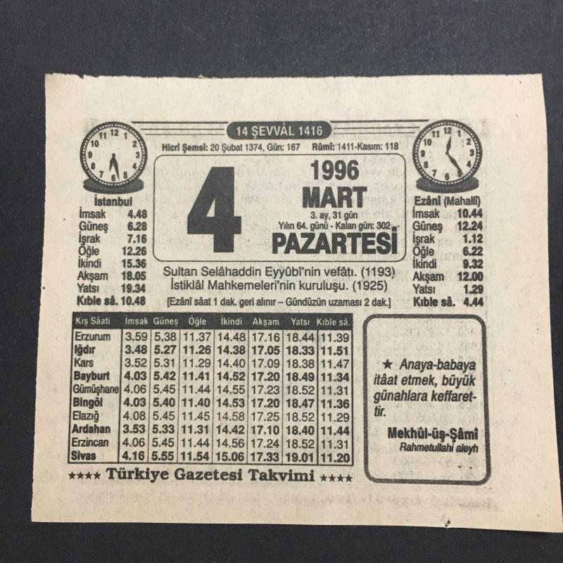 4 MART 1996 -TAKVİM YAPRAĞI-DOĞUM GÜNÜ HEDİYESİ-TÜRKİYE GAZETESİ TAKVİMİ,SELAHADDİN EYYUBİNİN VEFATI,1193,İSTİKLAL MAHKEMELERİNİN KURULUŞU 1925,SELAHADDİNİ EYYUBİ, en son 8 ay önce güncellenmiştir.
