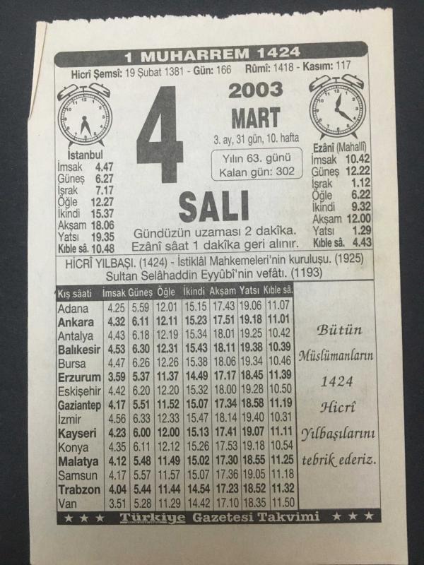 4 MART 2003-TAKVİM YAPRAĞI-DOĞUM GÜNÜ HEDİYESİ-TÜRKİYE GAZETESİ TAKVİMİ,HİCRİ YILBAŞI,1424,İSTİKLAL MAHKEMELERİNİN KURULUŞU 1925,SELAHATTİN EYYÜBİNİN VEFATI 1193,NASİHATLER, en son 8 ay önce güncellenmiştir.