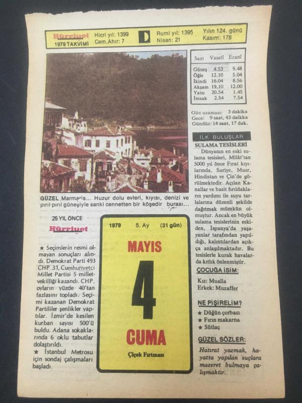 4 MAYIS 1979-TAKVİM YAPRAĞI-DOĞUM GÜNÜ HEDİYESİ-HÜRRİYET TAKVİMİ,ÇOCUĞA İSİM,KADIN ERKEK SÖZ GÜMÜŞSE,İSLAHİYEDE PANAYIR ÇERKEZKÖYDE PANAYIR,İZMİRDE SERGİ,TÜRKÇENİN RESMİ DİL OLARAK KABULÜ 1278, en son 8 ay önce güncellenmiştir.
