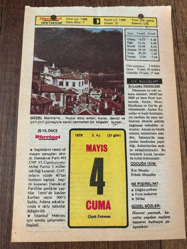 4 MAYIS 1979 - TAKVİM YAPRAĞI - DOĞUM GÜNÜ HEDİYESİ - HÜRRİYET TAKVİMİ - ÖLÜM TANRISI ROMANI - Gaziantep İslahiye ilçesinde panayır - Tekirdağ Çerkezköy'de panayır (3 gün) - İzmir'de sergi (15 gün) - Türkçe'nin resmi dil olarak kabulü (1278) başlıklı ürün, Efemera, Müzik, Sinema > Belge ve Evraklar > Takvimler kategorisi altında İkinci El olarak satılmaktadır.