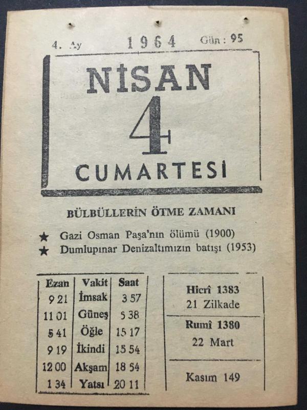 4 NİSAN 1964 -TAKVİM YAPRAĞI-DOĞUM GÜNÜ HEDİYESİ,BÜLBÜLLERİN ÖTME ZAMANI,GZİ OSMAN PAŞA NIN ÖLÜMÜ 1900,DUMLUPINAR DENİZALTININ BATIŞI,1953,HASTA NAMAZI, en son 8 ay önce güncellenmiştir.