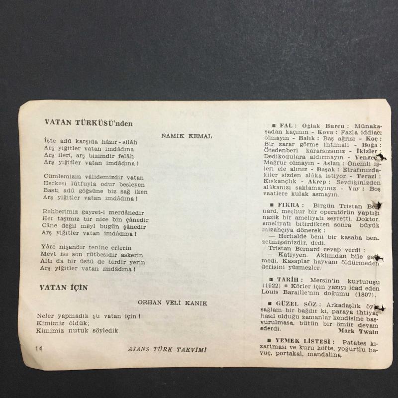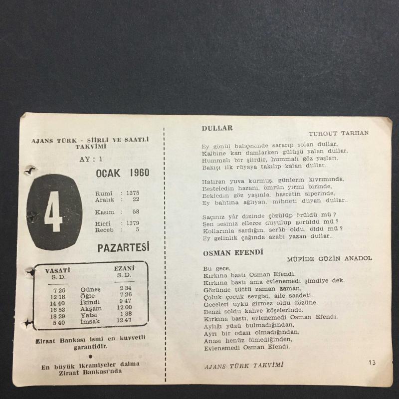 4 OCAK 1960 -TAKVİM YAPRAĞI-DOĞUM GÜNÜ HEDİYESİ-AJANS TÜRK-ŞİİRLİ VE SAATLİ TAKVİMİ,TURGUT TARHAN,MÜFİDE GÜZİN ANADOL,NAMIK KEMAL,ORHAN VELİ KANIK,FAL,FIKRA,MERSİNİN KURTULUŞU 1922,LOUİS BARAİLLENİN DOĞUMU 1807,GÜZEL SÖZ,YEMEK LİSTESİ başlıklı ürün, Efemera, Müzik, Sinema > Belge ve Evraklar > Takvimler kategorisi altında İkinci El olarak satılmaktadır.