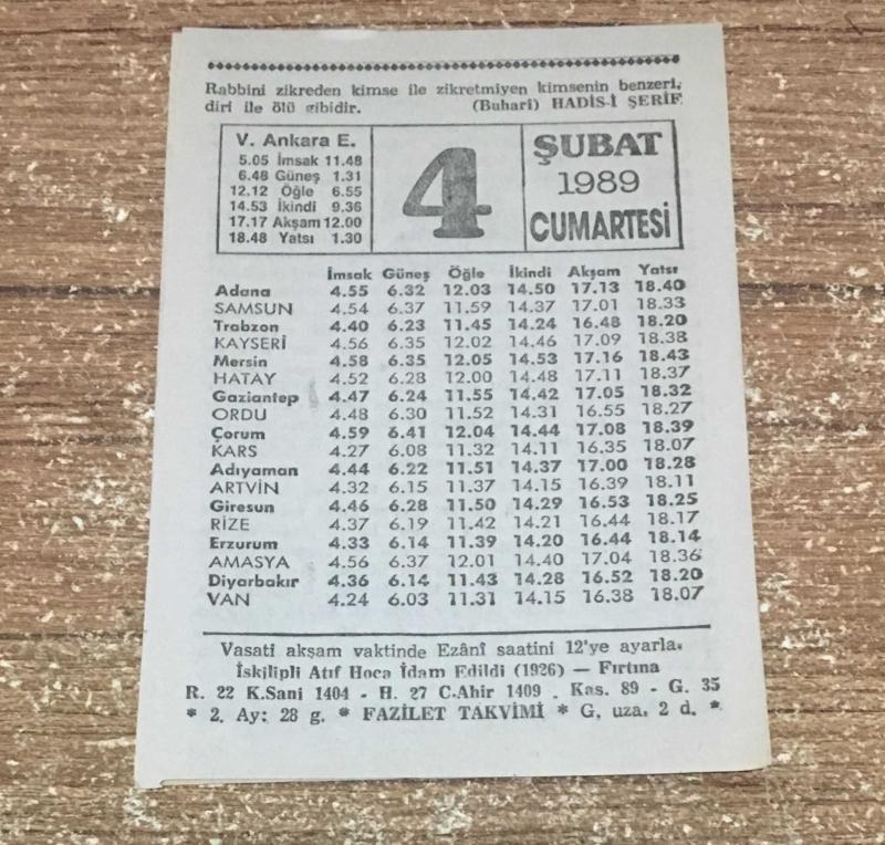 4 ŞUBAT 1989 CUMARTESİ ( Fazilet Takvimi Yaprağı ), dün satışa sunulmuştur.