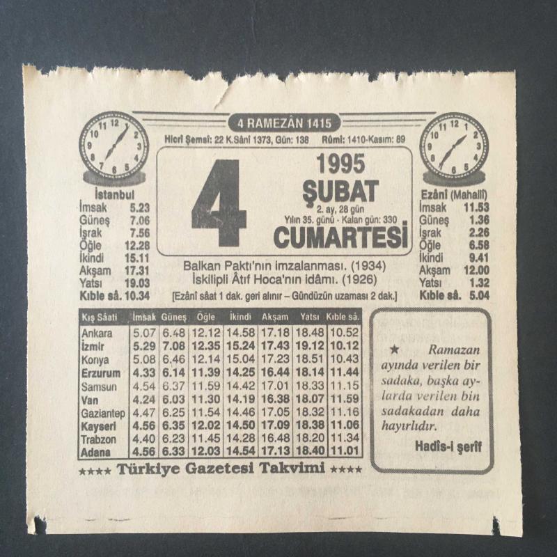 4 ŞUBAT 1995 -TAKVİM YAPRAĞI-DOĞUM GÜNÜ HEDİYESİ-TÜRKİYE GAZETESİ TAKVİMİ,BALKAN PAKTININ İMZALANMASI 1934,İSKİLİPLİ ATIF HOCANIN İDAMI 1926,ORUCU BOZMAYAN ŞEYLER,CADDEDEKİ EVLER, en son 8 ay önce güncellenmiştir.
