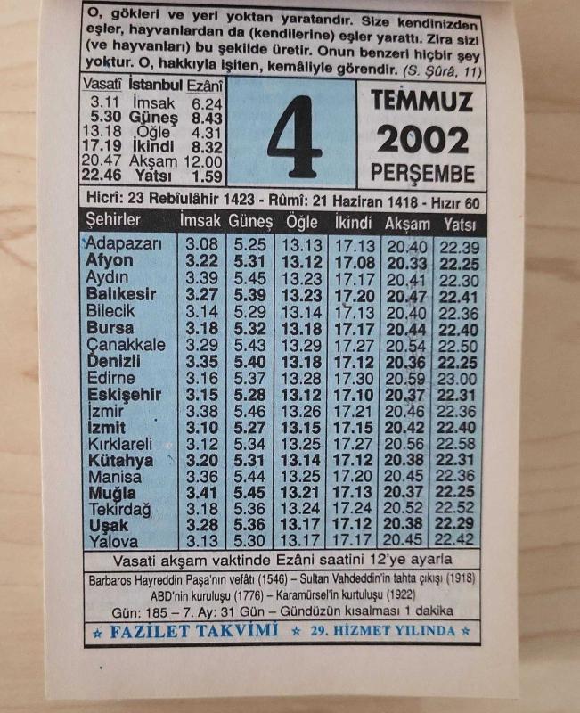 4 TEMMUZ 2002 PERŞEMBE - TAKVİM YAPRAĞI - DOĞUM GÜNÜ HEDİYESİ - FAZİLET TAKVİMİ - BARBAROS HAYREDDİN PAŞA'NIN VEFATI (1546)-SULTAN VAHDEDDİN'İN TAHTA ÇIKIŞI (1918)-ABD'NİN KURULUŞU (1776)-KARAMÜRSEL'İN KURTULUŞU (1922)-M U H A L E F E T Ü N L İ ' L-H A V A D İ S, bir ay önce satışa sunulmuştur.