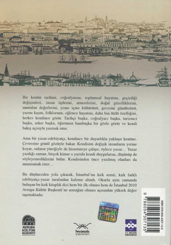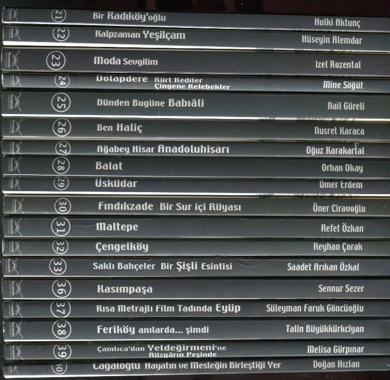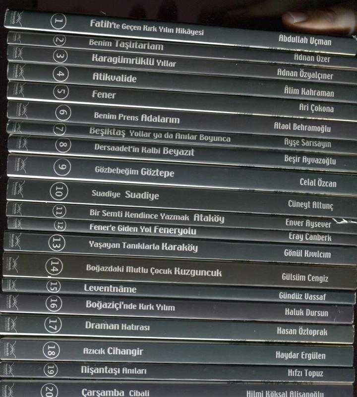 Fatih'te Geçen Kırk Yılın Hikâyesi Abdullah Uçman Benim Taşlıtarlam Adnan Özer Karagümrüklü Yıllar Adnan Özyalçıner Atikvalide Âlim Kahraman Fener Ari Çokona Benim Prens Adalarım Ataol Behramoğlu Beşiktaş Yollar ya da Anılar Boyunca Ayşe Sarısayın Dersaadet'in Kalbi Beyazıt Beşir Ayvazoğlu Gözbebeğim Göztepe Celal Özcan Suadiye Suadiye Cüneyt Altunç Bir Semti Kendince Yazmak Ataköy Enver Aysever Fener'e Giden Yol Feneryolu Eray Canberk Yaşayan Tanıklarla Karaköy Gönül Kıvılcım Boğazdaki Mutlu Çocuk Kuzguncuk Gülsüm Cengiz Leventnâme Gündüz Vassaf Boğaziçi'nde Kırk Yılım Haluk Dursun Draman Hatırası Hasan Öztoprak Azıcık Cihangir Haydar Ergülen Nişantaşı Anıları Hıfzı Topuz Çarşamba Cibali Hilmi Köksal Alisanoğlu Bir Kadıköy'oğlu Hulki Aktunç Kalpzaman Yeşilçam Hüseyin Alemdar Moda Sevgilim İzel Rozental Dolapdere: Kurt Kediler Çingene Kelebekler Mine Söğüt Dünden Bugüne Babıâli Nail Güreli Ben Haliç Nusret Karaca Ağabey Hisar Anadoluhisarı Oğuz Karakartal Balat Orhan Okay Üsküdar Ömer Erdem Fındıkzade Bir Sur içi Rüyası Öner Ciravoğlu Maltepe Refet Özkan Çengelköy Reyhan Çorak Saklı Bahçeler Bir Şişli Esintisi Saadet Arıkan Özkal Kasımpaşa Sennur Sezer Kısa Metrajlı Film Tadında Eyüp Süleyman Faruk Göncüoğlu Feriköy anılarda... şimdi Talin Büyükkürkciyan Çamlıca'dan Yeldeğirmeni'ne Rüzgârın Peşinde Melisa Gürpınar Cağaloğlu Hayatın ve Mesleğin Birleştiği Yer Doğan Hızlan