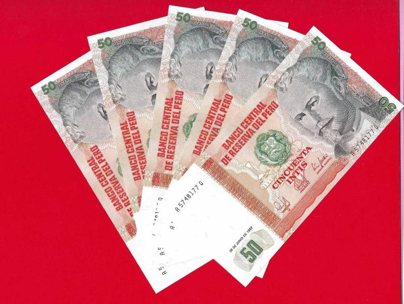 5 Adet Peru, 50 Intis, 1987, A-prefix, P-131, UNC ÇİL, bir ay önce satışa sunulmuştur.