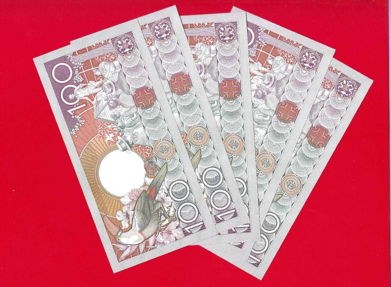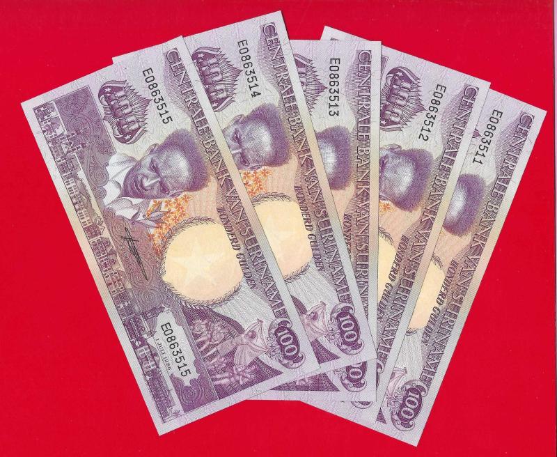 5 Adet SURINAME 100 Gulden, 1986, P-133a, UNC ÇİL, bir ay önce satışa sunulmuştur.