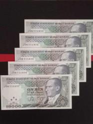 5 Adet Sıralı Takipli 7. Emisyon 10.000 Türk Lirası Eski Koleksiyon Kağıt Para. T.C Banknotlar. Cumhuriyet Dönemi.