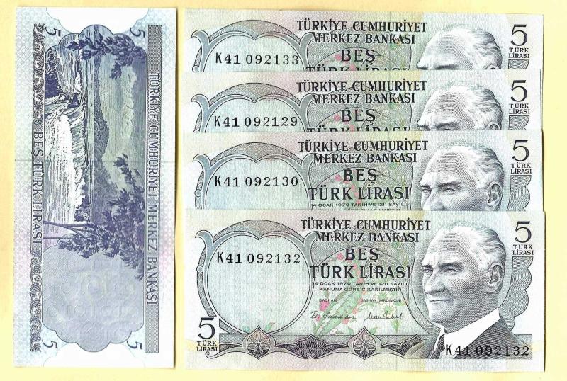 5 Adet TURKEY 5 Lira ----- PREFIX K41 -----1976 UNC ÇİL, bir ay önce satışa sunulmuştur.