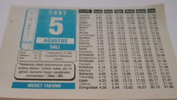 5 Ağustos 1997-Orijinal Takvim Yaprağı-Doğum Günü-Söz,Nişan,Nikâh,Düğün ve Önemli Günler Hediyesi-Hicret Takvimi-Ayet(Hadis)-(İsra-30)-Fransızlar'ın 45 Bin Cezayirli'yi Öldürmesi(1945)-Şamil'in Cevabı-Kur'an'dan Sorular-Hz.Ali(r.a.), en son 6 gün önce güncellenmiştir.