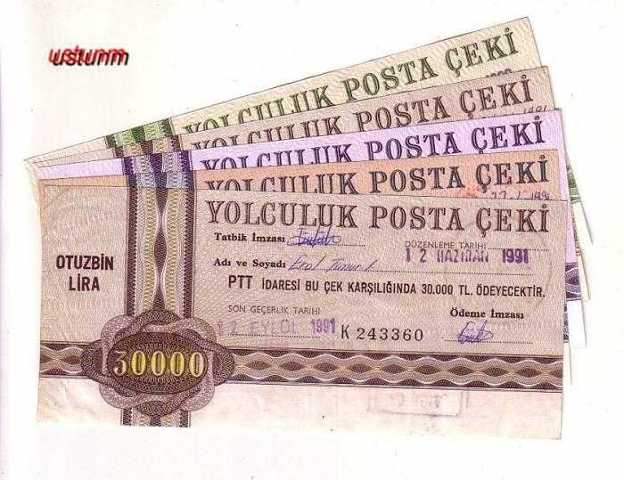 ** YOLCULUK POSTA ÇEKLERİ LOTU ** Herbiri değişik tarih ve valörlerde,5 adet temiz yolculuk posta çeki...