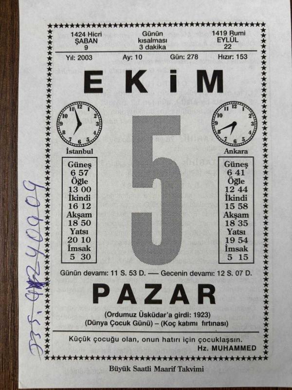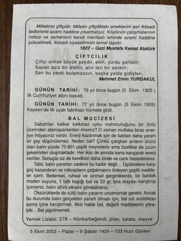 5 EKİM 2003 - TAKVİM YAPRAĞI - DOĞUM GÜNÜ HEDİYESİ - BÜYÜK SAATLİ MAARİF TAKVİMİ - HZ.MUHAMMED - GAZİ MUSTAFA KEMAL ATATÜRK - MEHMET EMİN YURDAKUL - İLK CUMHURİYET ALTINI BASILDI - KAYSERİ'DE İLK UÇAK FABRİKASI DEVREYE GİRDİ - BAL MUCİZESİ, en son 8 ay önce güncellenmiştir.