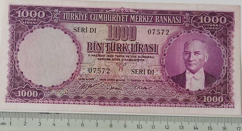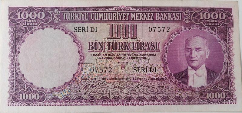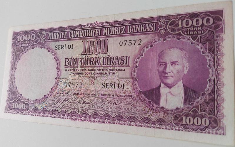 5.EMİSYON 1.TERTİP 1000 TÜRK LİRASI (MOR BİNLİK) KAĞIT PARADIR SERİ D1 07572 NOLU ÇOK ÇOK TEMİZ KONDİSYONDADIR KATALOK DEĞERİ;2000 DOLAR ÇOK ÇOK NADİR, 16 gün önce satışa sunulmuştur.