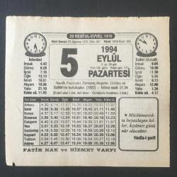 5 EYLÜL 1994 -TAKVİM YAPRAĞI-DOĞUM GÜNÜ HEDİYESİ-FATİH HAK VE HİZMET VAKFI TAKVİMİ,NAZİLLİ PAZARYERİ DOMANİÇ ALAŞEHİR GÖRDES VE SALİHLİNİN KURTULUŞLARI 1922,ABDULHAMİD VE İNGİLİZLER,ŞOFBEN MONTAJI,KAHVALTI