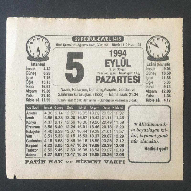 5 EYLÜL 1994 -TAKVİM YAPRAĞI-DOĞUM GÜNÜ HEDİYESİ-FATİH HAK VE HİZMET VAKFI TAKVİMİ,NAZİLLİ PAZARYERİ DOMANİÇ ALAŞEHİR GÖRDES VE SALİHLİNİN KURTULUŞLARI 1922,ABDULHAMİD VE İNGİLİZLER,ŞOFBEN MONTAJI,KAHVALTI başlıklı ürün, Efemera, Müzik, Sinema > Belge ve Evraklar > Takvimler kategorisi altında İkinci El olarak satılmaktadır.