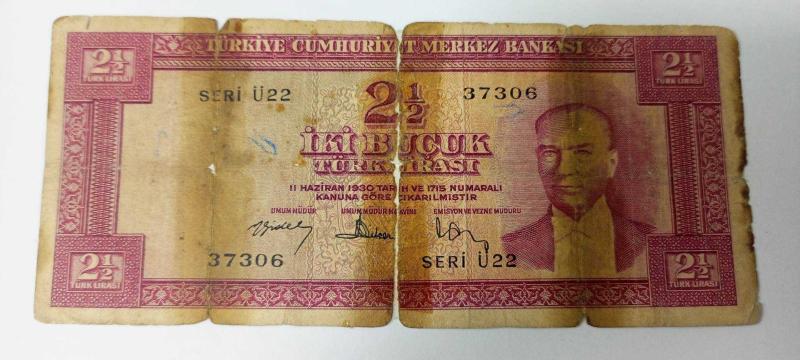 İlan Açıklaması: Emisyon: 5. Emisyon Tertip: 3. Tertip Nominal Değer: 2.5 TL (İki Buçuk Türk Lirası) Seri No: Ü22 37306 Ön Yüz: Atatürk Portresi Arka Yüz: Ankara'daki eski Merkez Bankası İdare Merkezi binası Kondisyon Notu: Para genel olarak yıpranmış durumdadır; orta kısmında belirgin bir katlanma/ayrılma izi, kenarlarda aşınmalar ve lekeler mevcuttur. Koleksiyoner terminolojisine göre "Düşük/Orta" kondisyon (Hırpalanmış/G) kategorisindedir. İmza: Dönemin Merkez Bankası yetkililerine ait orijinal imzalar (Zekeriya Aydın, Sait Erda, vb. dönemsel imzalar). Piyasa Değeri Hakkında Bilgi Bu banknotun piyasadaki değeri tamamen kondisyonuna (temizliğine) bağlı olarak çok geniş bir aralıkta değişmektedir: Çil (Kusursuz) Kondisyon: 15.000 TL - 22.500 TL bandına kadar çıkabilmektedir. Çok Temiz Kondisyon: 4.500 TL - 8.000 TL civarında alıcı bulabilmektedir.