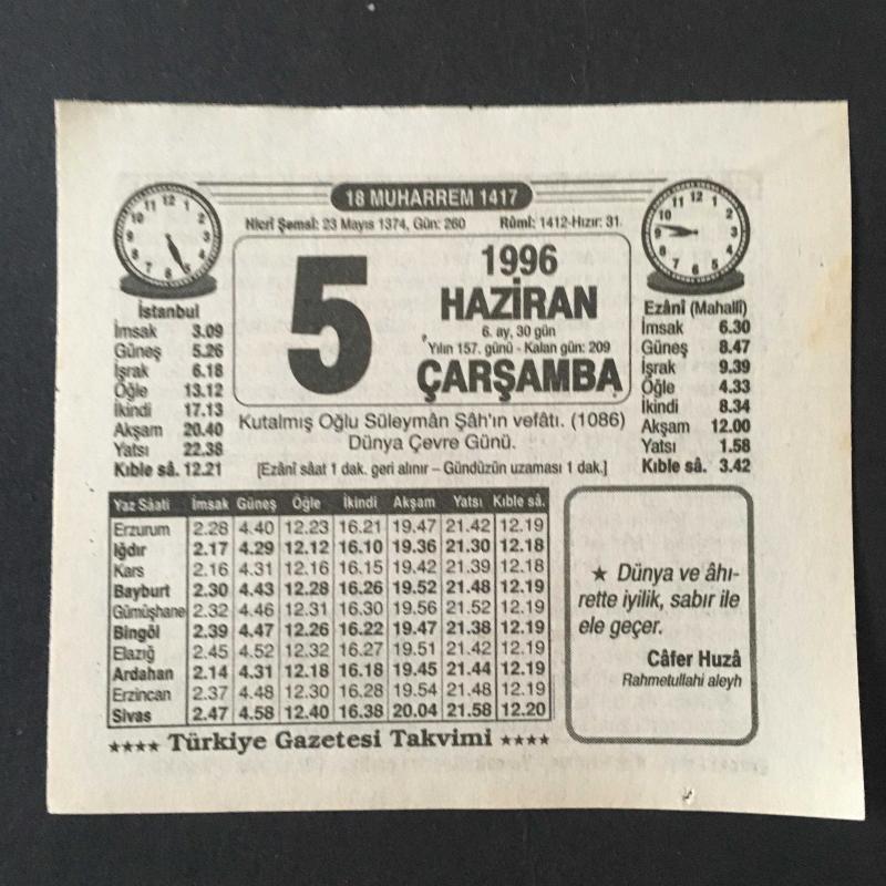 5 HAZİRAN 1996 -TAKVİM YAPRAĞI-DOĞUM GÜNÜ HEDİYESİ-TÜRKİYE GAZETESİ TAKVİMİ,KUTALMIŞ OĞLU SÜLEYMAN ŞAH IN VEFATI 1086,DÜNYA ÇEVRE GÜNÜ başlıklı ürün, Efemera, Müzik, Sinema > Belge ve Evraklar > Takvimler kategorisi altında İkinci El olarak satılmaktadır.