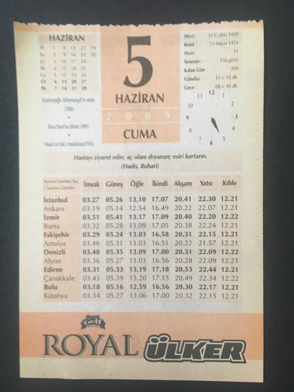 5 HAZİRAN- 2009 -TAKVİM YAPRAĞI-DOĞUM GÜNÜ HEDİYESİ-ÜLKER TAKVİMİ,KUTALMIŞGİL SÜLEYMANŞAHIN VEFATI 1086,KOCA YUSUFUN ÖLÜMÜ,1891,MUSLUN IRAKA BIRAKILMASI 1926,KARARAN PERDELER,ÇOCUĞUNUZUN İSMİ,CİĞERLİ MANTARLI OMLET başlıklı ürün, Efemera, Müzik, Sinema > Belge ve Evraklar > Takvimler kategorisi altında İkinci El olarak satılmaktadır.