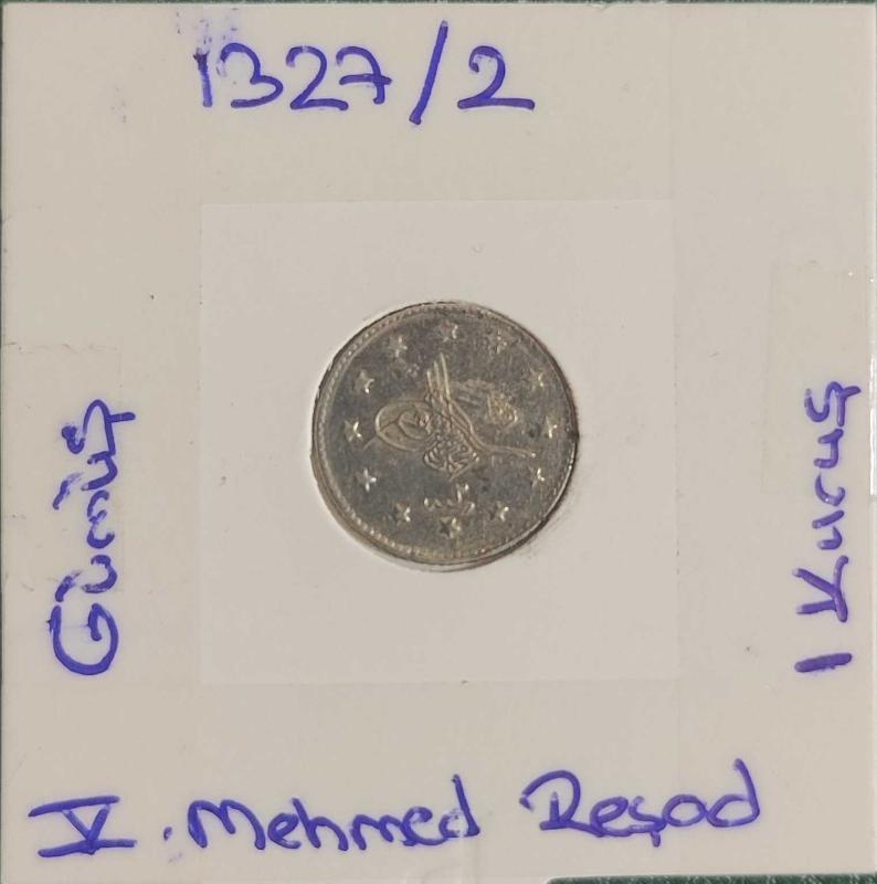 1 Kuruş HAKKINDA BİLGİLER 1327/2 yılında basılan 1 Kuruş; Osmanlı İmparatorluğu para kataloğu içerisinde bulunan Sultan 5. Mehmed Reşad (1909 - 1918) dönemine ait paralardandır. Kostantiniye darphanesinde 8.770.000 adet basılmıştır. Paranın nadirlik derecesi BULUNABİLİR olarak sınıflandırılmıştır. Paranın cülus numarası, ٢ simgesiyle, basım yılı ise ١٣٢٧ simgesiyle gösterilmiştir. Paranın ön yüzünde yanında 'Reşad' mahlası altında cülus numarası (2) ve 'sene' ibaresi, arka yüzünde ise 'Konstantiniye darphanesinde basıldı' yazısı ve altında padişahın tahta çıkış tarihi olan (1327) rakamı bulunmaktadır. Para; Gümüş madeninden/bileşiminden imal edilmiştir. Bu paralar ortalama 1.21 gram ağırlığa ve 15.09 milimetre genişliğe sahiptir.