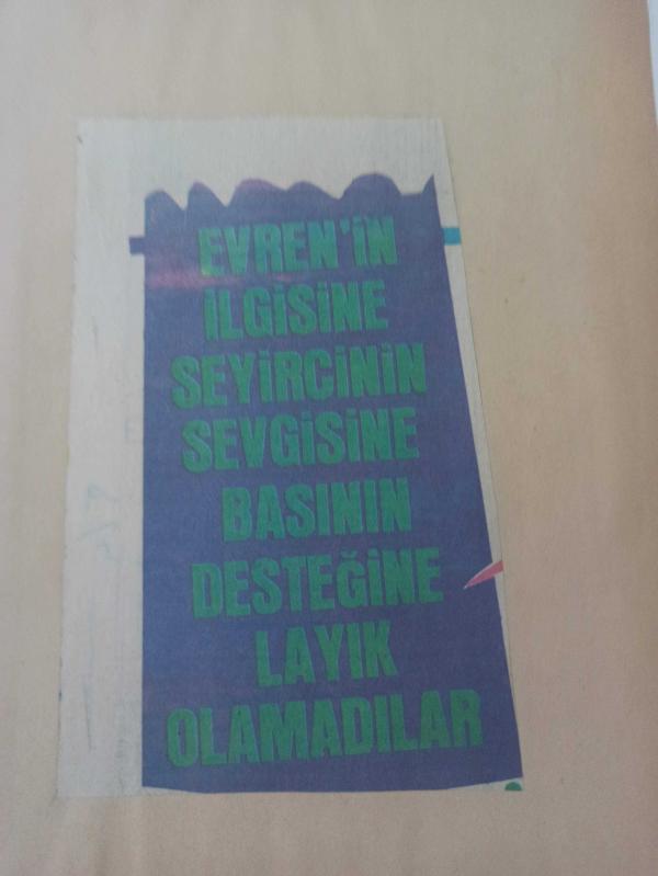 5 Nisan 1984 - Kenan Evren'in ilgisine seyircinin sevgisine basının desteğine layık olamadılar - Gazete haberi - Tek Yaprak Arkalı Önlüdür, Erol Duru tarafından kaleme alınmıştır. Kitap 1984 yılında yayınlanmıştır. 2 sayfadır. 5 Nisan 1984 - Kenan Evren'in ilgisine seyircinin sevgisine basının desteğine layık olamadılar - Gazete haberi - Tek Yaprak Arkalı Önlüdür adlı eser Türkçe dilindedir.