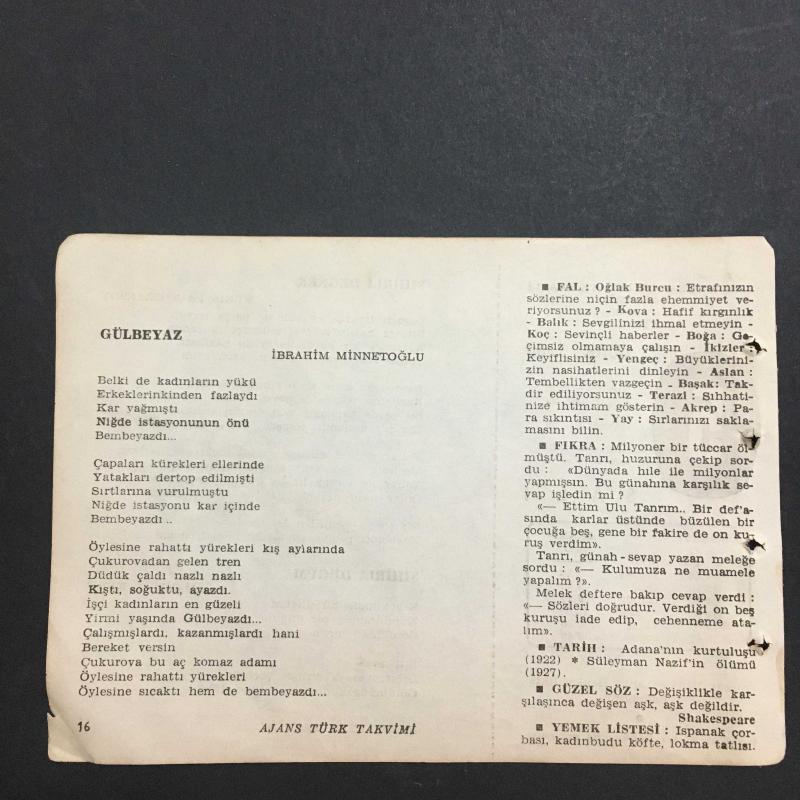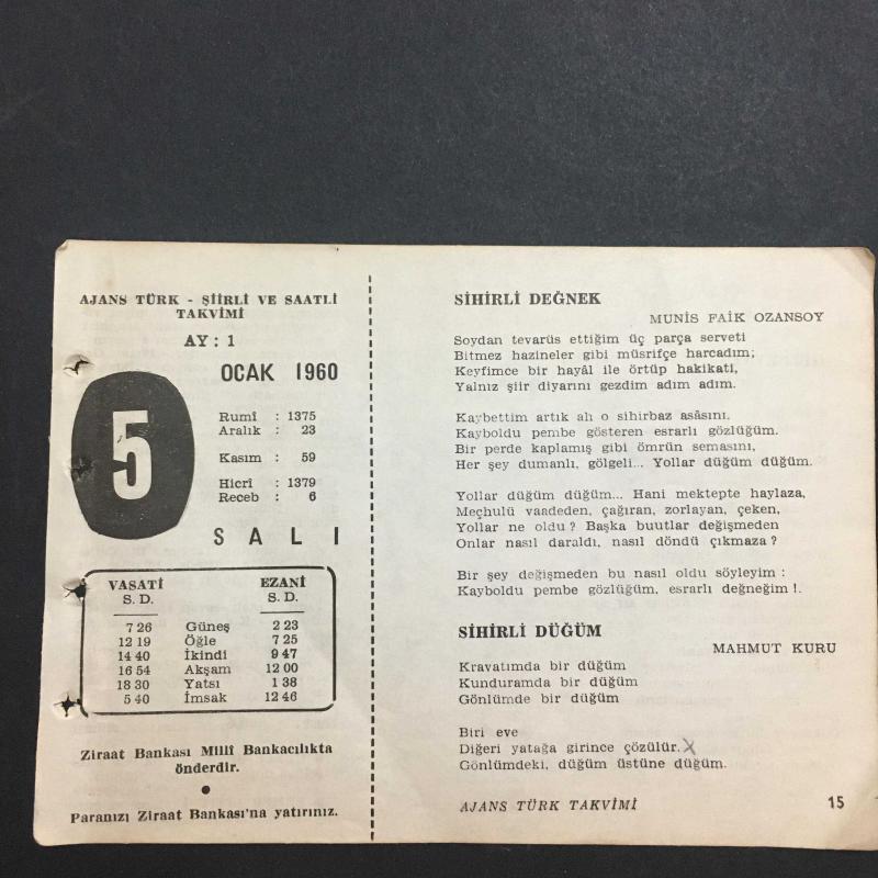 5 OCAK 1960 -TAKVİM YAPRAĞI-DOĞUM GÜNÜ HEDİYESİ-AJANS TÜRK-ŞİİRLİ VE SAATLİ TAKVİMİ,MUNİS FAİK OZANSOY,MAHMUT KURU,İBRAHİM MİNNETOĞLU,FAL,FIKRA,ADANANIN KURTULUŞU 1922,SÜLEYMAN NAZİFİN ÖLÜMÜ 1927,GÜZEL SÖZ,YEMEK LİSTESİ başlıklı ürün, Efemera, Müzik, Sinema > Belge ve Evraklar > Takvimler kategorisi altında İkinci El olarak satılmaktadır.