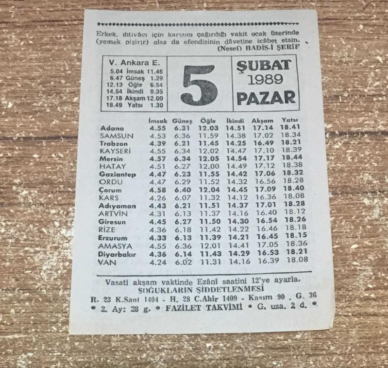 5 ŞUBAT 1989 PAZAR ( Fazilet Takvimi Yaprağı ), dün satışa sunulmuştur.
