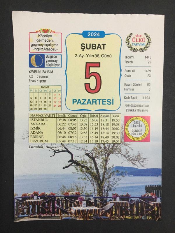 5 ŞUBAT 2024 -TAKVİM YAPRAĞI-DOĞUM GÜNÜ HEDİYESİ-VASIF ÜLKÜ TAKVİMİ,İSTANBUL BÜYÜKADA,YAVRUNUZA İSİM,ABD TÜRKİYEYE SİLAH AMBARGOSU BAŞLATTI 1975,ABD UÇAK FİRMASI LOCKHEED TÜRKİYE DAHİL BİR ÇOK ÜLKEDE RÜŞVET VERDİĞİ ORTAYA ÇIKTI,1976,ANKARA ULUCANLAR CEZAEVİ MÜZESİ,MENSUCATTAN TRİKOYA,KADAYIF TÜRLERİ başlıklı ürün, Efemera, Müzik, Sinema > Belge ve Evraklar > Takvimler kategorisi altında İkinci El olarak satılmaktadır.