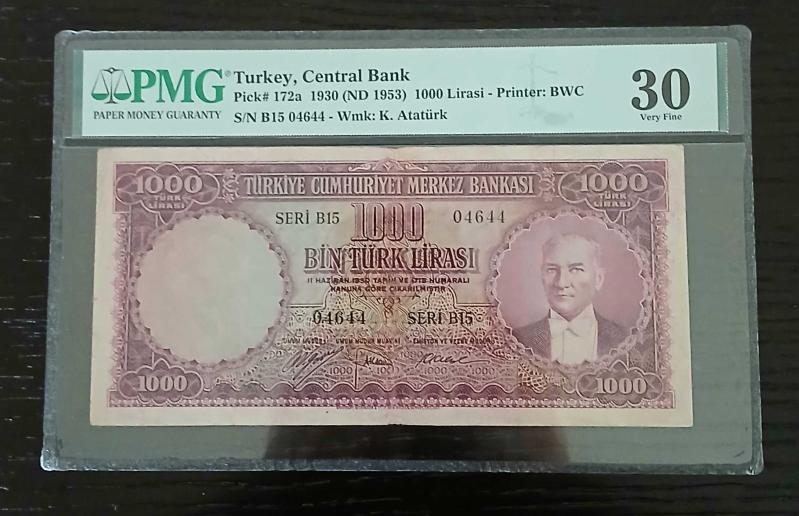 PMG sertifikalı 5.emisyon 1000 TL (Morbin) Seri B15 (degerli seridir) Ürün natureldir,herhangi bir dolgu,işlem,onarım yoktur, orjinaldir