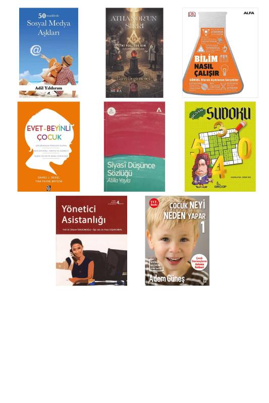 50 Maddede Sosyal Medya Aşkları - Athanor’un Sırrı - Bilim Nasıl Çalışır? - Evet - Beyinli Çocuk - Siyasi Düşünce Sözlüğü - Sudoku Jigsaw - Yönetici Asistanlığı - Çocuk Neyi Neden Yapar - 1