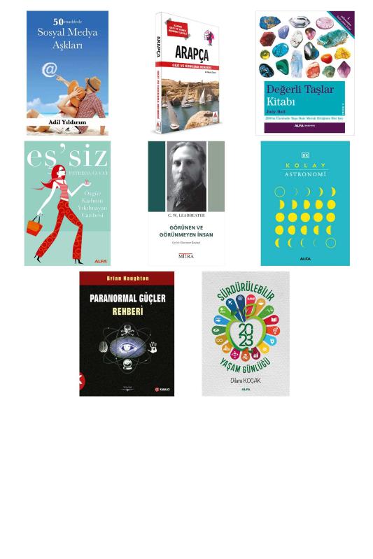 50 Maddede Sosyal Medya Aşkları - Arapça Gezi ve Konuşma Rehberi - Değerli Taşlar Kitabı - Eş'siz - Görünen ve Görünmeyen İnsan - Kolay Astronomi (Ciltli) - Paranormal Güçler Rehberi - Sürdürülebilir Yaşam Günlüğü 2023