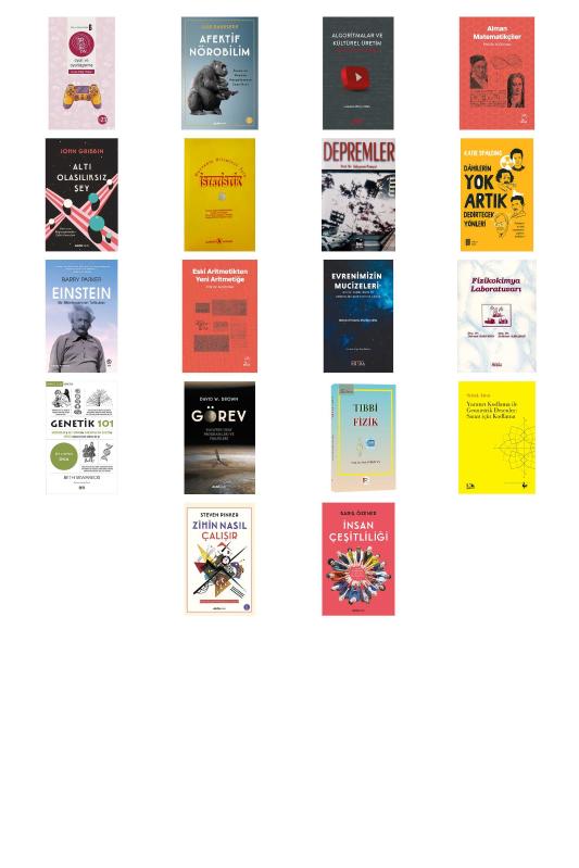 50 Soruda Oyun ve Oyunlaştırma - Afektif Nörobilim - Algoritmalar ve Kültürel Üretim - Alman Matematikçiler - Altı Olasılıksız Şey - Davranış Bilimleri İçin İstatistik - Depremler - Dâhilerin Yok Artık Dedirtecek Yönleri - Einstein - Bir Biliminsanının Tutkuları - Eski Aritmetikten Yeni Aritmetiğe - Evrenimizin Mucizeleri - FİZİKOKİMYA LABORATUVARI - Genetik 101 - Görev - Nasa’nın Uzay Programları ve Projeleri - Tıbbi Fizik - Yaratıcı Kodlama ile Geometrik Desenler: Sanat için Kodlama - Zihin Nasıl Çalışır - İnsan Çeşitliliği