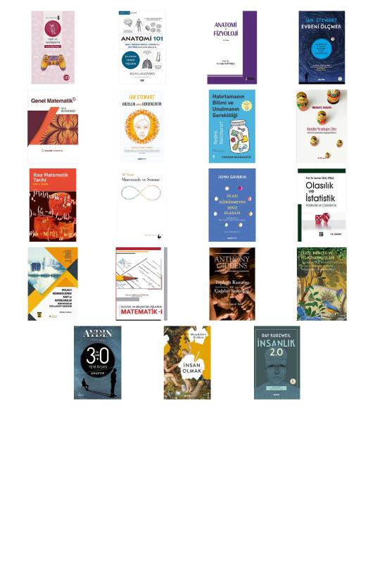 50 Soruda Oyun ve Oyunlaştırma - Anatomi 101 - Anatomi ve Fizyoloji - Evreni Ölçmek - Genel Matematik 2 - Güzellik Neden Gerçekliktir - Hatırlamanın Bilimi ve Unutmanın Gerekliliği - Kendini Yineleyen Zihin - Kısa Matematik Tarihi - Matematik ve Sonsuz - Olası Görünmeyen Sekiz Olasılık - Olasılık ve İstatistik - Patlayıcı Mühendisliği Uygulamalarında Kayıt ve Raporlamalar - Sosyal ve Beşeri Bilimlerde Matematik - 1 - Toplum Kuramı ve Çağdaş Sosyoloji - Çekiç Mercek ve Yelkovankuşları - İnsan 3.0 - Arketip - İnsan Olmak - İnsanlık 2.0