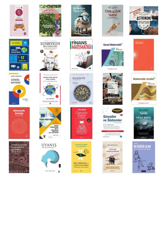 50 Soruda Oyun ve Oyunlaştırma - Açıklamalı Genel Botanik ve Bitki Anatomisi Atlası - Bir Nefeste Yapay Zekâ - Canlılığın Tarihi - Dakikalar İçinde Astronomi - Dünyayı Değiştiren 17 Denklem - Einstein Bulmacası - Finans Matematiği - Genel Matematik 1 - Geometri - Görüş Devrimi - Hemen Her Şeyin Kısa Tarihi - Kalkülüs - 1.Cilt - Kapadokya’da Çevre Koruma Politikaları - Yasal Yönetsel ve Planlama Boyutları - Matematik Analiz 2 - Matematik Sözlüğü - Patlayıcı Mühendisliği Uygulamalarında Kayıt ve Raporlamalar - Rakamların Evrensel Tarihi Cilt 2 - Sinyaller ve Sistemler - Tanrı ve Yeni Fizik - Tekniğin ve Sanayinin Gelişim Süreci ve İzdüşümleri - Uyanış - Özel Görelilik ve Klasik Alan Kuramı Kuramsal Başlangıç - İcatlar Ansiklopedisi - İki Kişilik Alan