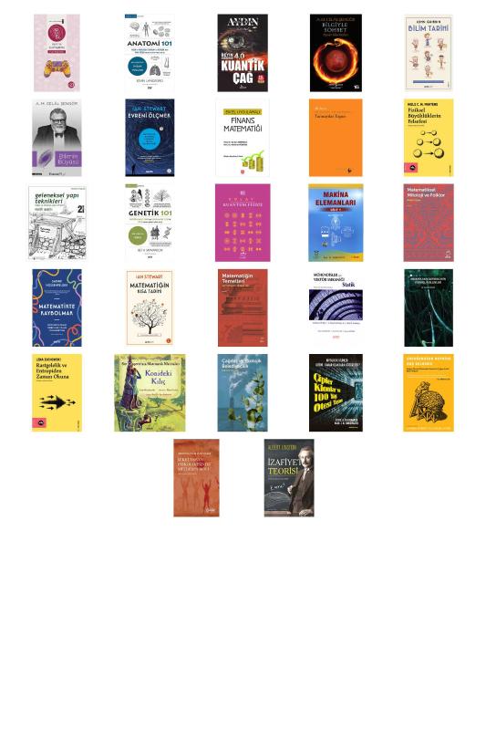 50 Soruda Oyun ve Oyunlaştırma - Anatomi 101 - Beyin Sizsiniz 4.0 - Kuantik Çağ - Bilgiyle Sohbet - Bilim Tarihi - Bilimin Büyüsü - Evreni Ölçmek - Excel Uygulamalı Finans Matematiği - Fen Liseleri İçin Matematik 3 - Tamsayılar Yapısı - Fiziksel Büyüklüklerin Felsefesi - Geleneksel Yapı Teknikleri - Genetik 101 - Kolay Kuantum Fiziği (Ciltli) - Makina Elemanları Cilt 1 - Matematiksel Mitoloji ve Folklor - Matematikte Kaybolmak - Matematiğin Kısa Tarihi - Matematiğin Temelleri - Mühendisler İçin Vektör Mekaniği - Statik - Organik Yarı İletkenlerin Fiziksel Özellikleri - Rastgelelik ve Entropiden Zaman Okuna - Sör Çepçevre'nin Matematik Maceraları - Konideki Kılıç - Çağdaş ve Ekolojk Belediyecilik - Çipler Klonlar ve 100 Yaş Ötesi Yaşam - Çocuğunuzun Beynine Hoş Geldiniz - İlkel İnsan Psikolojisinde Mitlerin Rolü - İzafiyet Teorisi