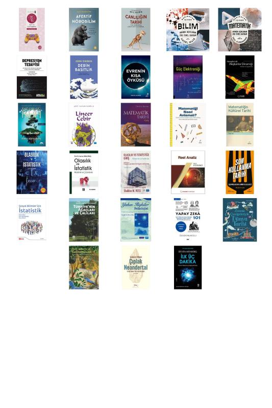 50 Soruda Oyun ve Oyunlaştırma - Afektif Nörobilim - Canlılığın Tarihi - Dakikalar İçinde Bilim - Dakikalar İçinde Matematik - Anında Açıklanan 200 Temel Kavram - Depresyon Tedavisi - Metakognitif, Bilişsel Davranışçı ve Üçüncü Dalga Terapiler - Derin Basitlik - Evrenin Kısa Öyküsü (Ciltli) - Güç Elektroniği - Hesaplamalı Akışkanlar Dinamiği - Kafamdaki Ruh - Lineer Cebir - Matematik Tarihi - Matematiği Nasıl Anlamalı? - Matematiğin Kültürel Tarihi - Olasılık ve İstatistik - Olasılık ve İstatistik - Olasılık ve İstatistiğe Giriş - Reel Analiz - Son Kullanma Tarihi - Sosyal Bilimler İçin İstatistik - Türkiye'nin Ağaçları ve Çalıları 1 - Yakın İlişkiler Psikolojisi - Yapay Zeka 101 - Zaman Çizelgeleriyle Dünya Tarihi - Çekiç Mercek ve Yelkovankuşları - Çıplak Neandertal - İlk Üç Dakika