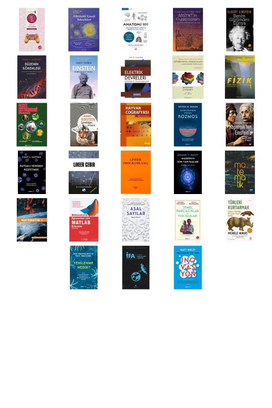 50 Soruda Oyun ve Oyunlaştırma - Alternatif Enerji Teknikleri - Anatomi 101 - Arşimetin Elyazmaları - Benim Gözümden Dünya - Düzenin Kökenleri (Ciltli) - Einstein - Bir Biliminsanının Tutkuları - Elektrik Devreleri - Çözümlü Problemleri - Elementer Diferansiyel Denklemler ve Sınır Değer Problemleri - Fizik 1 - Mekanik - Mekanik Dalgalar - Termodinamik - Genel Entomoloji (Tarımsal) - Göreliliğin Anlamı - Hayvan Coğrafyası - Kendiliğinden Evrilen Kozmos - Kopernik’ten Einstein’e - Kutsalı Yeniden Keşfetmek - Lineer Cebir - Lineer Programlama - Maddenin Son Yapıtaşları - Matematik - Matematik 1 - Mühendislik Öğrencileri İçin Matlab Kılavuzu - Sayılar Atlası 2 - Asal Sayılar - Temel Parçacıklar ve Fizik Yasaları - Türleri Kurtarmak - Yenilenme Nedir? - İFA: İnsanın Fabrika Ayarları 3. Kitap - Sınırları Aşmak - İnovasyonun Kısa Tarihi