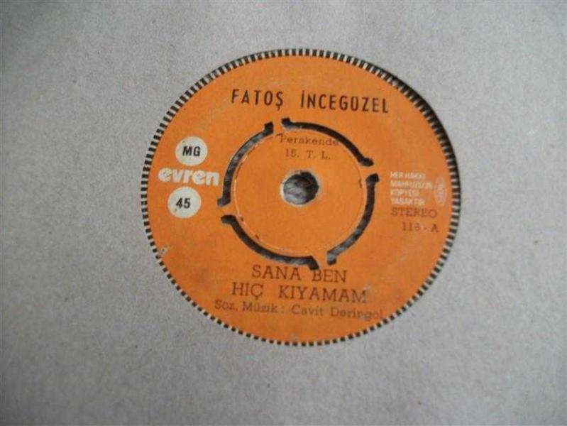 56 - FATOŞ İNCEGÜZEL - Sana ben hiç kıyamam - Kara yazı mısın? başlıklı ürün, Efemera, Müzik, Sinema > Müzik, Plak, Kaset, CD > Plak > Yerli Plaklar > Yerli 45 Devir Plak (45'lik) kategorisi altında İkinci El olarak satılmaktadır.