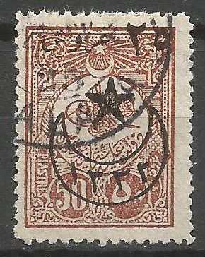 1908 50 KURUŞLUK POSTA PULU ÜZERİNE BEŞ KÖŞELİ YILDIZ VE AY SÜRSARJI PUL DAMGALIDIR. İSFİLA 2024 KATALOK NO: 665 BASIM TARİHİ: 29 ŞUBAT 1916 İSFİLA 2024 KATALOK FİYATI: 3.000,00 LİRA