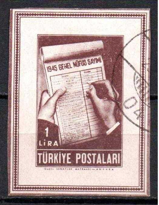 NÜFUS SAYIMI HATIRA BLOK İÇİ PUL PUL DAMGALIDIR. BASIM TARİHİ: 21 EKİM 1945 İSFİLA 2024 KATALOK FİYATI: 350,00 LİRA
