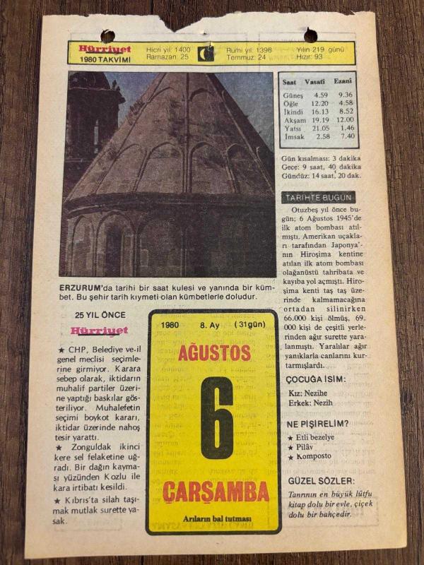 6 AĞUSTOS 1980 - TAKVİM YAPRAĞI - DOĞUM GÜNÜ HEDİYESİ - HÜRRİYET TAKVİMİ - DESTAN GİBİ ADLI ROMAN - 2. Dünya Savaşı'nda Amerikalılar tarafından Japonya'nın Hiroşima şehrine ilk atom bombasının atılışı. 66.000ölü, 69.000 yaralı (1945) - 1. Dünya Savaşı'nda düşman birliklerinin Anafartalar'a asker çıkarması (1915) başlıklı ürün, Efemera, Müzik, Sinema > Belge ve Evraklar > Takvimler kategorisi altında İkinci El olarak satılmaktadır.
