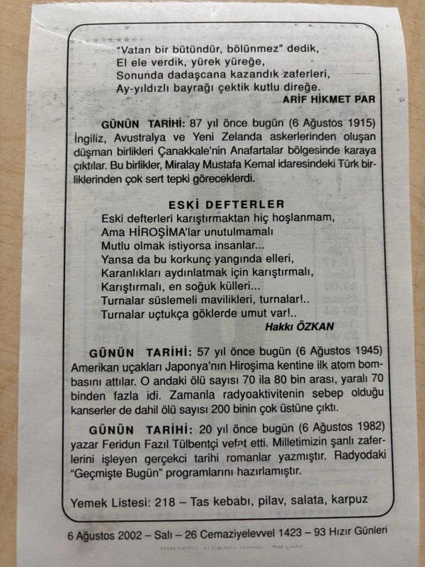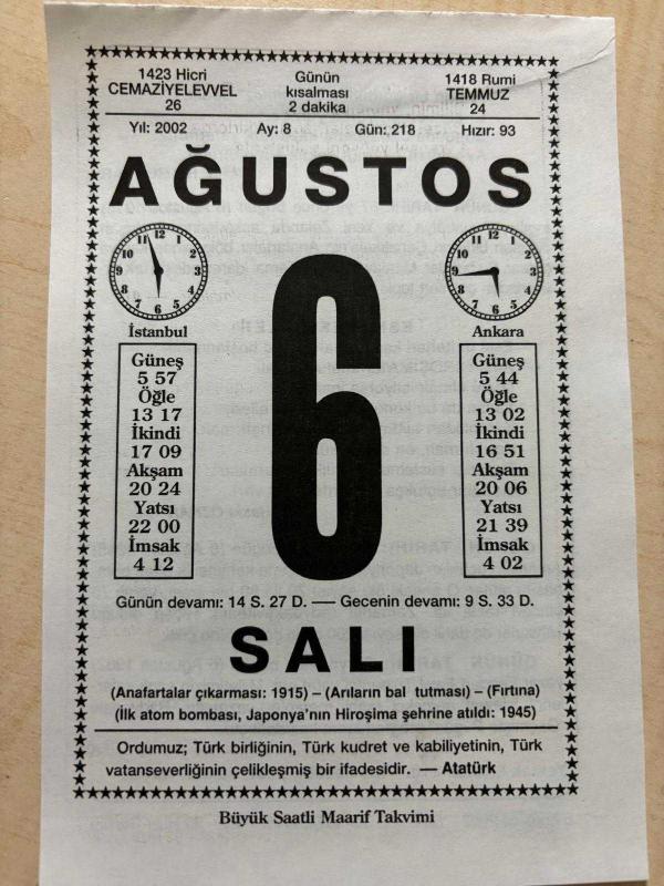 6 AĞUSTOS 2002 - TAKVİM YAPRAĞI - DOĞUM GÜNÜ HEDİYESİ - BÜYÜK SAATLİ MAARİF TAKVİMİ - ATATÜRK - ARİF HİKMET PAR - DÜŞMAN BİRLİKLERİ ÇANAKKALEYE ÇIKTILAR - HAKKI ÖZKAN - AMERİKAN UÇAKLARI JAPONYA'YA ATOM BOMBASI ATTI - YAZAR FERİDUN FAZIL TÜLBENTÇİ VEFAT ETTİ, en son 8 ay önce güncellenmiştir.